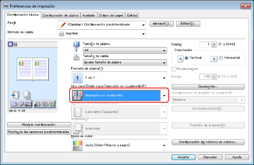 En la ficha [Configuración básica], seleccione [Impresión en cuadernillo] en la lista desplegable [Impresión a una cara/doble cara/en cuadernillo].