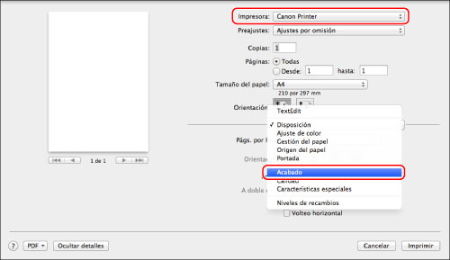 Seleccione la impresora que desea utilizar → haga clic en [Acabado].