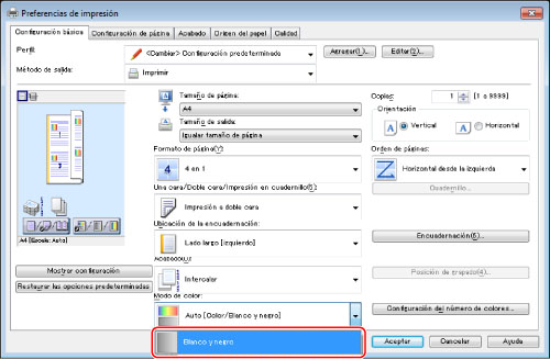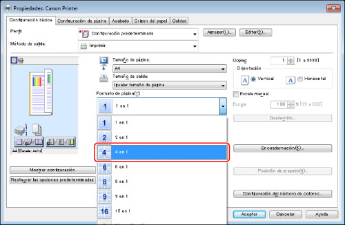 En la ficha [Configuración dásica], seleccione [4 en 1] en la lista desplegable [Formato de página].
