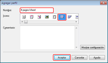 Introduzca un nombre, por ejemplo '4 pages/sheet', en [Nombre] → seleccione [