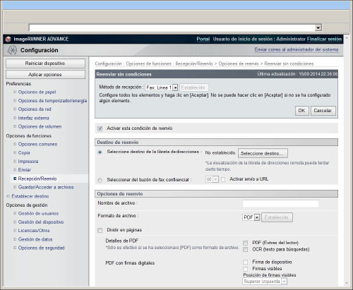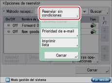 Haga clic en [Reenviar sin condiciones] → especifique el método de recepción, el destino de reenvío, el aviso fin de reenvío, y otras opciones.