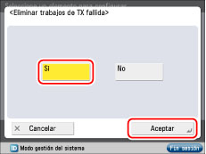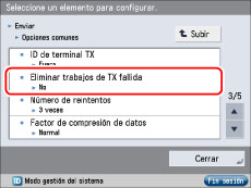 Pulse (Configuración) → [Opciones de funciones] → [Enviar] → [Opciones comunes] → [Eliminar trabajos de TX fallida].
