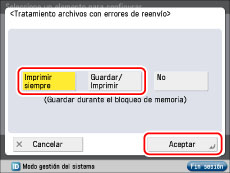 Pulse [Tratamiento archivos con errores de reenvío] → seleccione [Imprimir siempre] o [Guardar/Imprimir] → pulse [Aceptar].