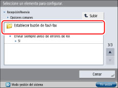 Pulse (Configuración) → [Opciones de funciones] → [Recepción/Reenvío] → [Opciones comunes] → [Establecer buzón de fax/I-fax].