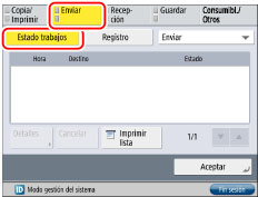 Pulse [Monitor estado/Cancel.] → [Enviar] → [Estado trabajos].