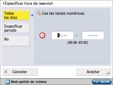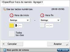 Si selecciona [Espec.hora de reenvío], puede establecer las opciones de validar/invalidar el reenvío basándose en el día o la hora. Por ejemplo, puede establecer invalidar el reenvío en horas en las que el ordenador esté apagado, como durante las horas de la noche y los días no laborables.