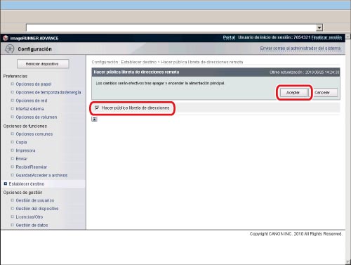 Acceda a la IU remota → haga clic en [Configuración] → [Establecer destino] → [Hacer pública libreta de direcciones remota].