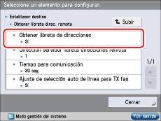 Seleccione [Obtener libreta de direcciones] → introduzca la dirección del servidor en <Dirección del servidor de libreta direcciones remota> → haga clic en [Aceptar].