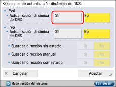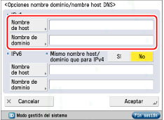 (Configuración) → [Preferencias] → [Red] → [Opciones de TCP/IP] → [Opciones de DNS] → [Opciones de dirección del servidor DNS].
