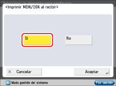 (Configuración) → [Opciones de funciones] → [Enviar] → [Opciones de e-mail/I-fax] → [Imprimir MDN/DSN al recibir].