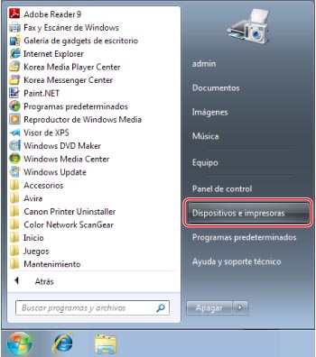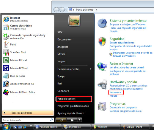 ] (Iniciar) → seleccione [Panel de control] → [Impresora].