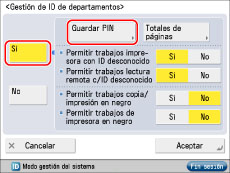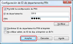 Seleccione [Permitir la opción de PIN] → introduzca el ID y el PIN del departamento que guardó en el paso 4 de "Opciones del equipo" → pulse [Aceptar].