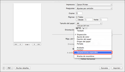 Seleccione la impresora que vaya a utilizar → seleccione el panel [Caracteristicas especiales].