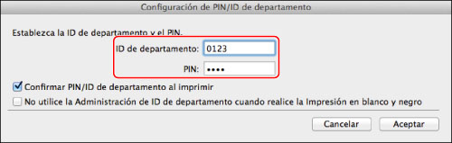 Aparece el cuadro de diálogo [Configuración de ID de departamento/PIN].