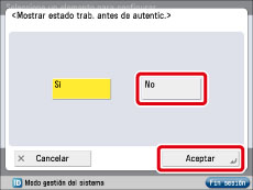 Pulse [Mostrar estado trab. antes de autentic.] → [No] → [Aceptar].