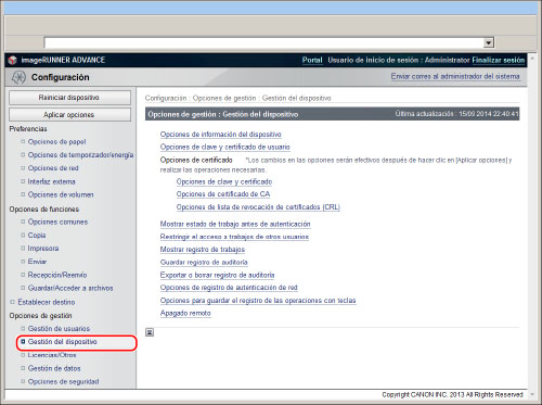 Pulse (Configuración) → [Opciones de gestión] → [Gestión del dispositivo].