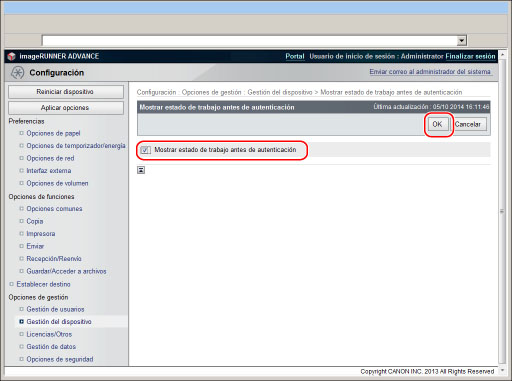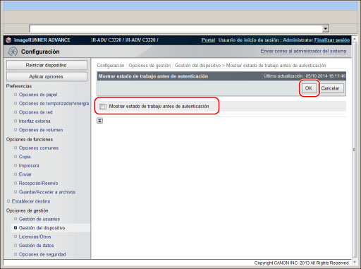 Para especificar el estado del trabajo antes de las opciones de visualización de autenticación, haga clic en [Mostrar estado de trabajo antes de autenticación] → deseleccione [Mostrar estado de trabajo antes de autenticación] → haga clic en [Aceptar].