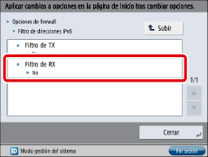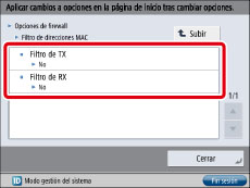 (Configuración) → [Preferencias] → [Red] → [Opciones de firewall] → [Filtro de direcciones MAC].