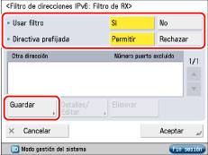 Pulse [Sí] en [Usar filtro] → pulse [Rechazar] en [Directiva prefijada] → pulse [Guardar].