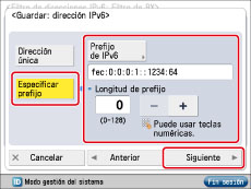 Pulse [Especificar prefijo] → especifique la dirección con prefijo en IPv6 a la que permitirá la transmisión de datos → pulse [Siguiente].