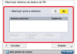 (Configuración) → [Opciones de funciones] → [Enviar] → [Opciones de e-mail/I-fax] → [Restringir dominios de destino de TX].