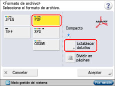 Puede convertir imágenes de originales en color/escala de gris leídas con un resolución de 300 ppp para compactarlas en archivos PDF o XPS (aprox. 1/10 del tamaño original). Este modo elimina la emisión de tamaño de archivo grande de documentos digitalizados, reduciendo los documentos de color al tamaño de documentos en blanco y negro. Esto también le permite reducir la carga de la red y de los servidores. Para obtener más información, consulte