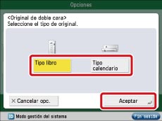 Pulse [Original de doble cara] → especifique el tipo de original de doble cara → pulse [Aceptar].