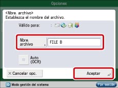 Pulse [Nbre. archivo] → introduzca un nombre de archivo con el teclado → pulse [Aceptar].