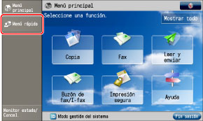 El menú rápido es una función que aumenta la eficiencia de tareas rutinarias y repetitivas que emplea el equipo. Podrá crear y guardar una serie de funciones utilizadas con frecuencia, tales como Copia, Leer y enviar, y Leer y guardar en un mismo botón.