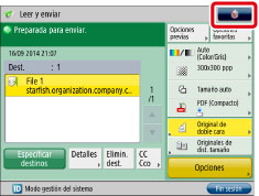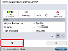 Si selecciona [Sí], al recuperar el botón guardado, aparece una pantalla de confirmación de las opciones. Para más información acerca de la pantalla de confirmación, consulte, " Enviar un documento utilizando el botón del menú rápido". Si selecciona [No], al recuperar el botón guardado no aparece la pantalla de confirmación de las opciones.