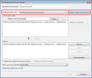 Seleccione [Libreta de direcciones del dispositivo] desde la lista desplegable [Libreta de direcciones] → haga clic en [Adquirir libreta de direcciones].