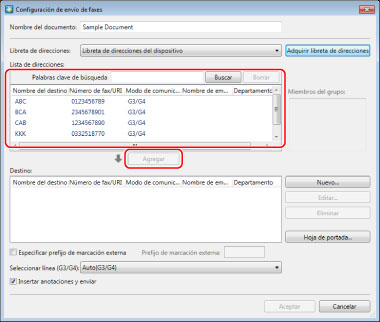 Para añadir una dirección que no esté registrada en la libreta de direcciones de imageRUNNER ADVANCE como destino de la transmisión de fax, abra el cuadro de diálogo [Agregar nuevas direcciones de destino] desde el cuadro de diálogo [Configuración de fax].