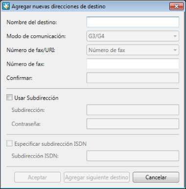 Los elementos que pueden introducirse en el cuadro de diálogo [Agregar nuevas direcciones de destino] son los siguientes: