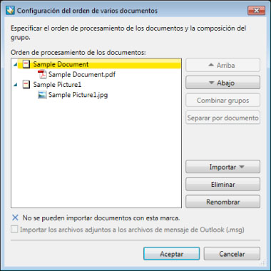 Para cambiar el orden, seleccione un documento en [Orden de procesamiento de los documentos] y haga clic en [Arriba] o [Abajo]. Haga clic en [Aceptar] cuando termine.