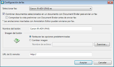 Seleccione el menú [Herramientas] → [Configuración de la barra de salida] → [Configuración] → nombre de imageRUNNER ADVANCE definido en el icono Salida de fax → [Cambiar] para que aparezca el cuadro de diálogo [Configuración de fax]. Para enviar por fax varios documentos como un único documento de cuaderno, seleccione [Combinar documentos seleccionados en un documento con Document Binder para enviar un fax].