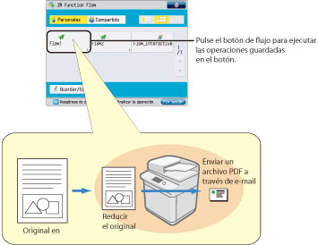 Estas aplicaciones le permiten guardar una combinación de funciones que utilice frecuentemente en el botón "flujo". Podrá utilizar repetidamente la misma combinación de funciones con total sencillez, simplemente pulsando este botón.