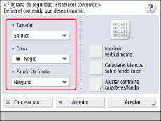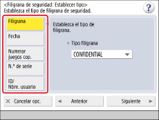 El texto que introduzca en [Person.] no se guarda automáticamente. Si usa [Filigrana de seguridad] y desea guardar la filigrana de seguridad recién creada para seleccionarla cuando lo necesite, pulse [Guardar] → introduzca el texto que va a guardar.