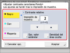 La opción [Ajustar contraste caracteres/fondo] se cancela cuando finaliza el trabajo. Si desea utilizar las mismas opciones para el siguiente trabajo de copia, vuelva a especificar la configuración.