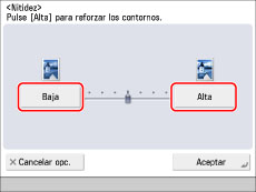 Establezca la nitidez en [Alta] si desea copiar documentos originales que contienen texto o líneas finas. Establezca la nitidez en [Baja] si desea copiar documentos originales que contienen fotografías impresas u otros tonos medios.