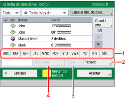 Pulse las teclas alfanuméricas (por ejemplo, [ABC]) para que aparezcan las teclas individuales correspondientes a cada letra o número. Puede seleccionar una letra o número para limitar el intervalo de caracteres. Pulse [Todo] para volver a la lista completa de direcciones.