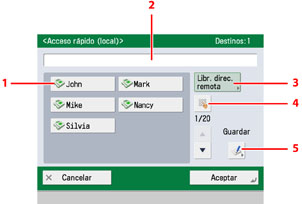 Puede acceder a los destinos de acceso rápido de otro equipo de la serie imageRUNNER ADVANCE para especificar un destino. [A Local] aparece cuando se muestran los botones de acceso rápido de la libreta de direcciones remota.