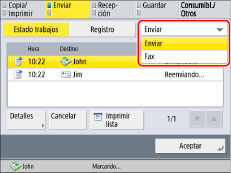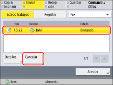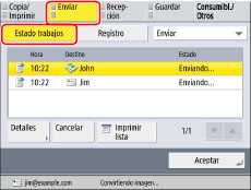 Si está activado [Restringir el acceso a trabajos de otros usuarios] en [Opciones de gestión] (Configuración), los trabajos enviados por otros usuarios se muestran como asteriscos ('********') y no se pueden llevar a cabo operaciones en ellos. Si ha iniciado sesión como administrador, se muestran los trabajos de todos los usuarios y puede ver la información o cancelar los trabajos.