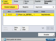Pulse [Copia/impres.] → [Estado trabajos].