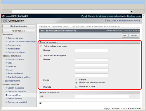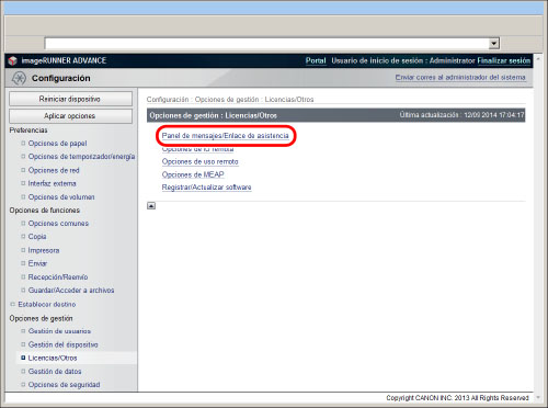 Haga clic en [Configuración] → seleccione [Licencias/Otros] en el menú que aparece en Opciones de gestión → haga clic en [Panel de mensajes/Enlace de asistencia].