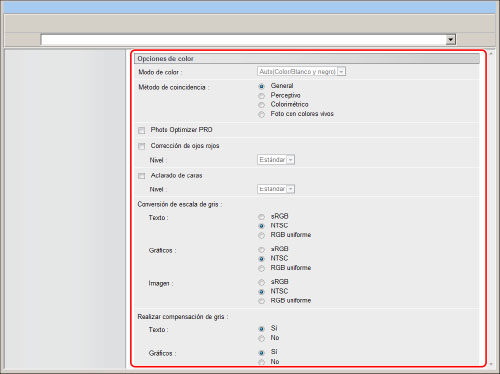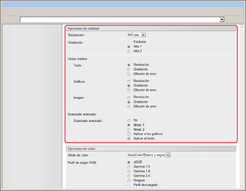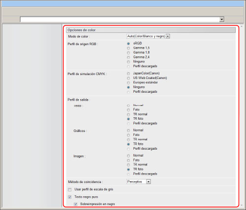 Esta opción le permitirá especificar el perfil RGB (datos de color representados utilizando el modelo de colores RGB (Red Green Blue (rojo, verde, y azul))) que sea apropiado para las características de su monitor. Esta opción se aplica cuando se imprime un documento que contiene imágenes o gráficos en color hechos con el modelo de colores RGB.
