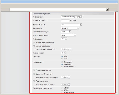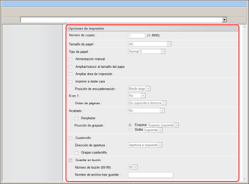 Las opciones de visualización de la pantalla táctil para utilizar con Impresión directa son [Opciones comunes], [Opciones de Imaging], [Opciones de PDF], [Opciones de XPS] y [Opciones de PS]. Para obtener más información acerca de estas opciones, consulte "Opciones de funciones: Impresora".