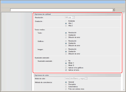 Si se establece [1200 ppp] para [Resolución], sólo se puede seleccionar [Estándar]. Si se establece [600 ppp] para [Resolución], sólo se puede seleccionar [Alta 1] o [Alta 2].