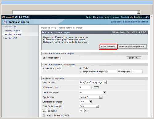 No haga clic repetidamente en [Iniciar impresión] cuando reenvíe un archivo. Es posible que el reenvío tarde un poco. Sin embargo, si se hace clic repetidamente en [Iniciar impresión] durante el reenvío, se puede producir un error y el archivo no se enviará.