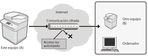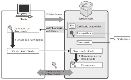 Puede lograr una comunicación cifrada segura cuando el usuario accede al equipo a través de un navegador web instalando un certificado de servidor en el equipo. Con la comunicación SSL, mediante el certificado de usuario y la clave pública se genera una clave común que sólo el usuario y el equipo pueden utilizar. De esta manera se puede impedir la intercepción y el robo de datos. Consulte