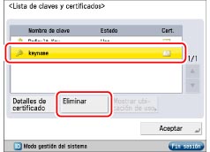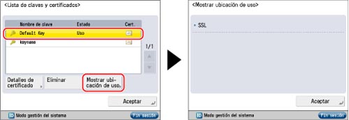 Los pares de claves para los que aparezca 'Uso' en <Estado> no pueden eliminarse porque están en uso con la autenticación IEEE802.1X/IPSec o porque está activado SSL. Pulse [Mostrar ubicación de uso] para comprobar el tipo de seguridad para el cual se usa el par de claves. Para eliminar un par de claves que sólo se utilice con SSL, desactive las siguientes opciones. Los pares de claves que se utilicen para la autenticación IEEE802.1X/IPSec no se pueden eliminar.